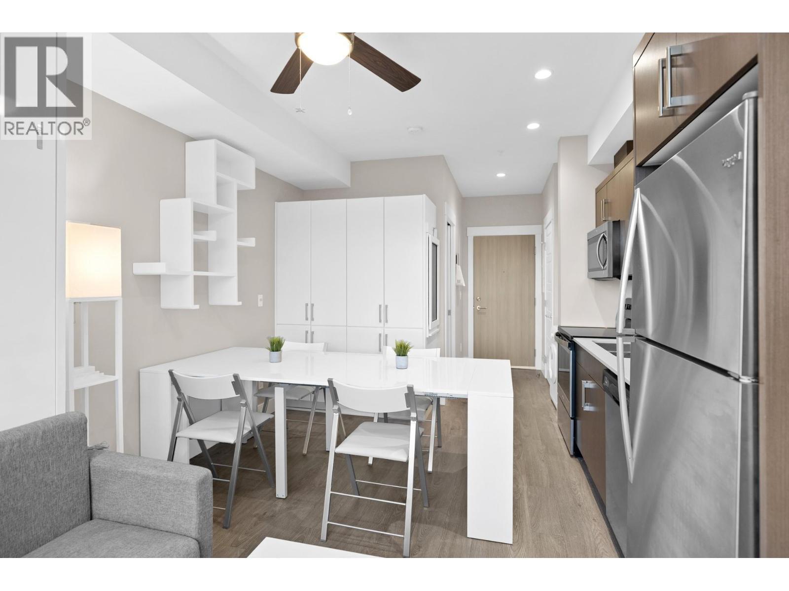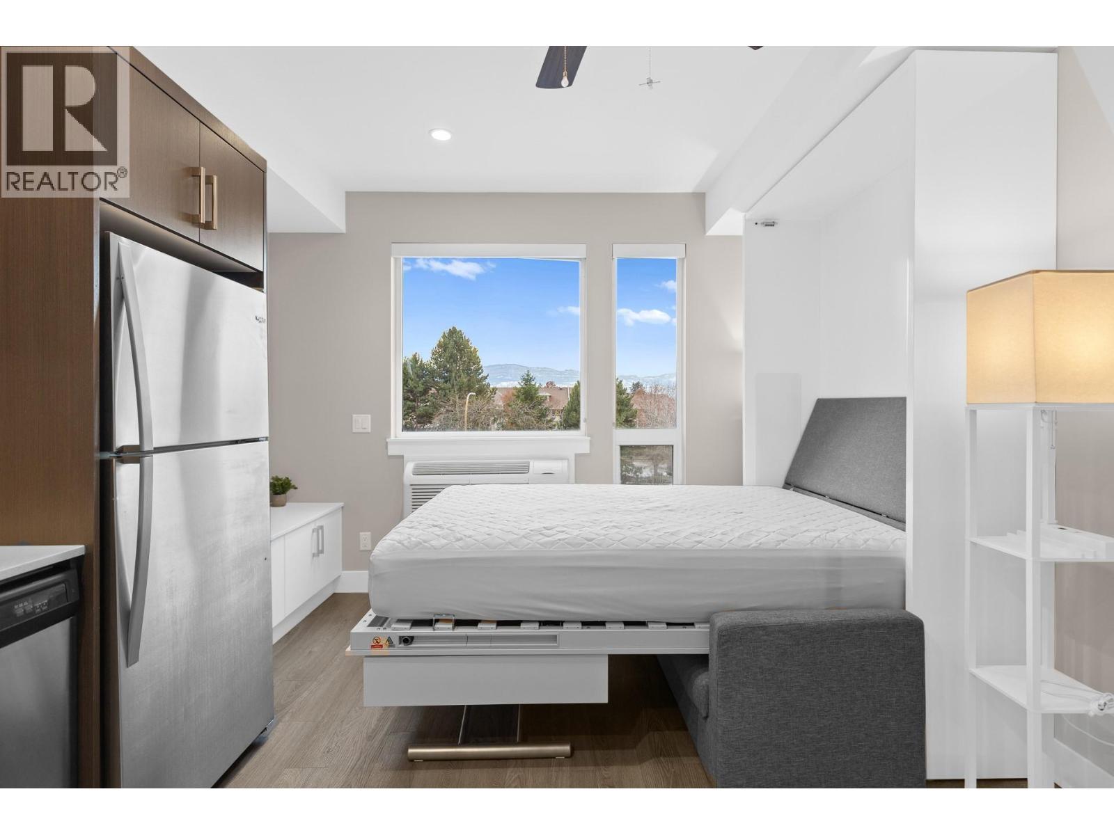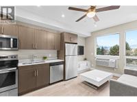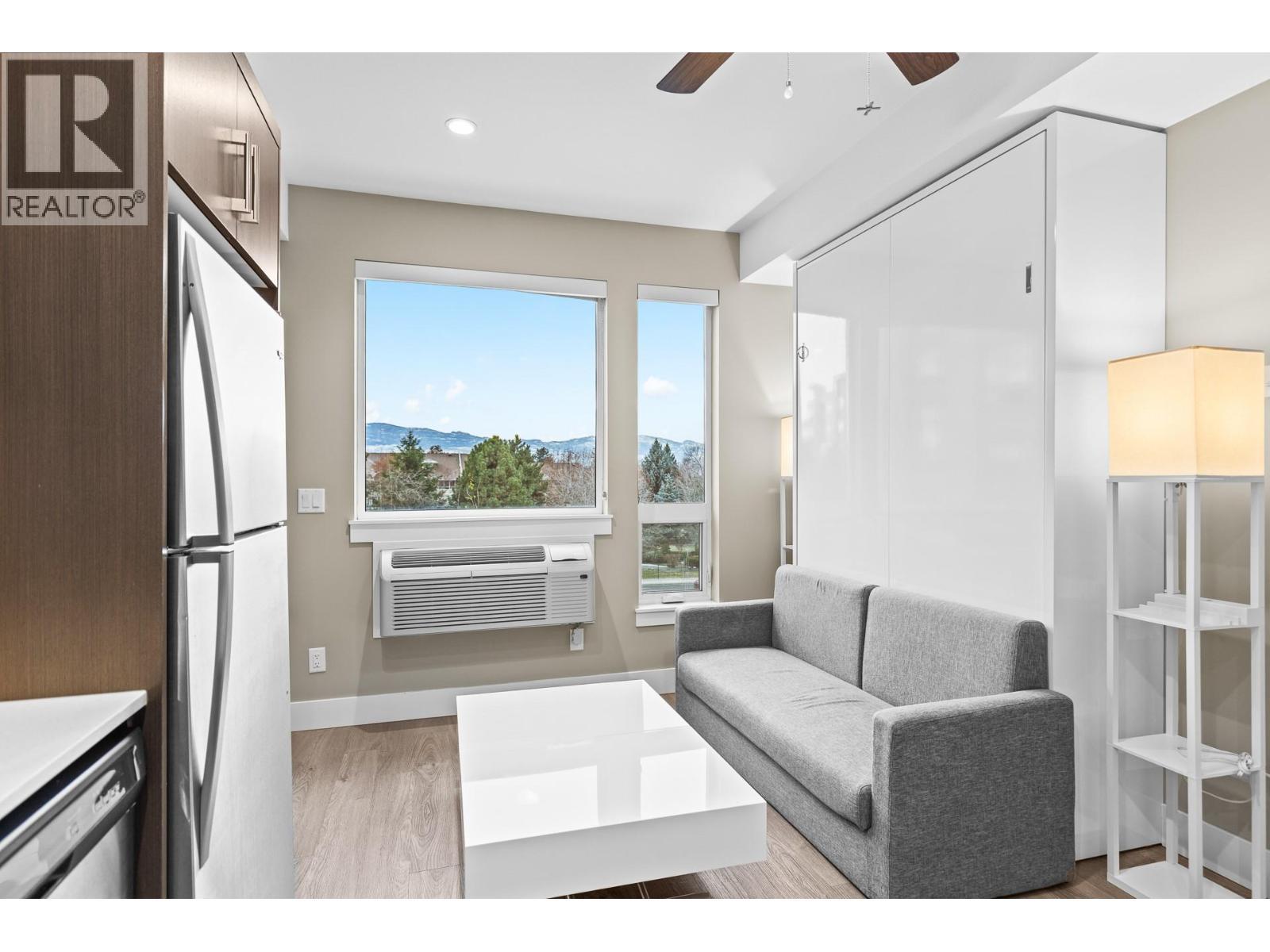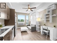 Welcome to Cambridge House - offering exceptional urban convenience in the heart of Kelowna. This 319 sq ft south-facing micro suite has been thoughtfully upgraded to maximize function and comfort featuring a custom Murphy Bed and built-in storage. The home is freshly painted and offered fully furnished, including sofa, TV, standing lamps, desk, chairs, and more, providing a turnkey living opportunity for owners or investors. The efficient layout includes stainless steel appliances, durable vinyl plank flooring, an in-suite washer/dryer, a 3-piece bathroom, and an in-wall heat pump/AC unit for year-round climate control. A covered parking stall and convenient same-floor 3' x 4' storage locker are included. Residents of Cambridge House enjoy an impressive selection of amenities, including a fully equipped fitness centre, residents’ lounge with games and seating areas and a landscaped garden terrace with BBQ area. The building is also pet-friendly (up to two pets, max 25 lbs each). Located steps from downtown, transit, and everyday amenities, this property appeals to first-time buyers, students, and investors seeking low-maintenance living in a central location. (id:6769)