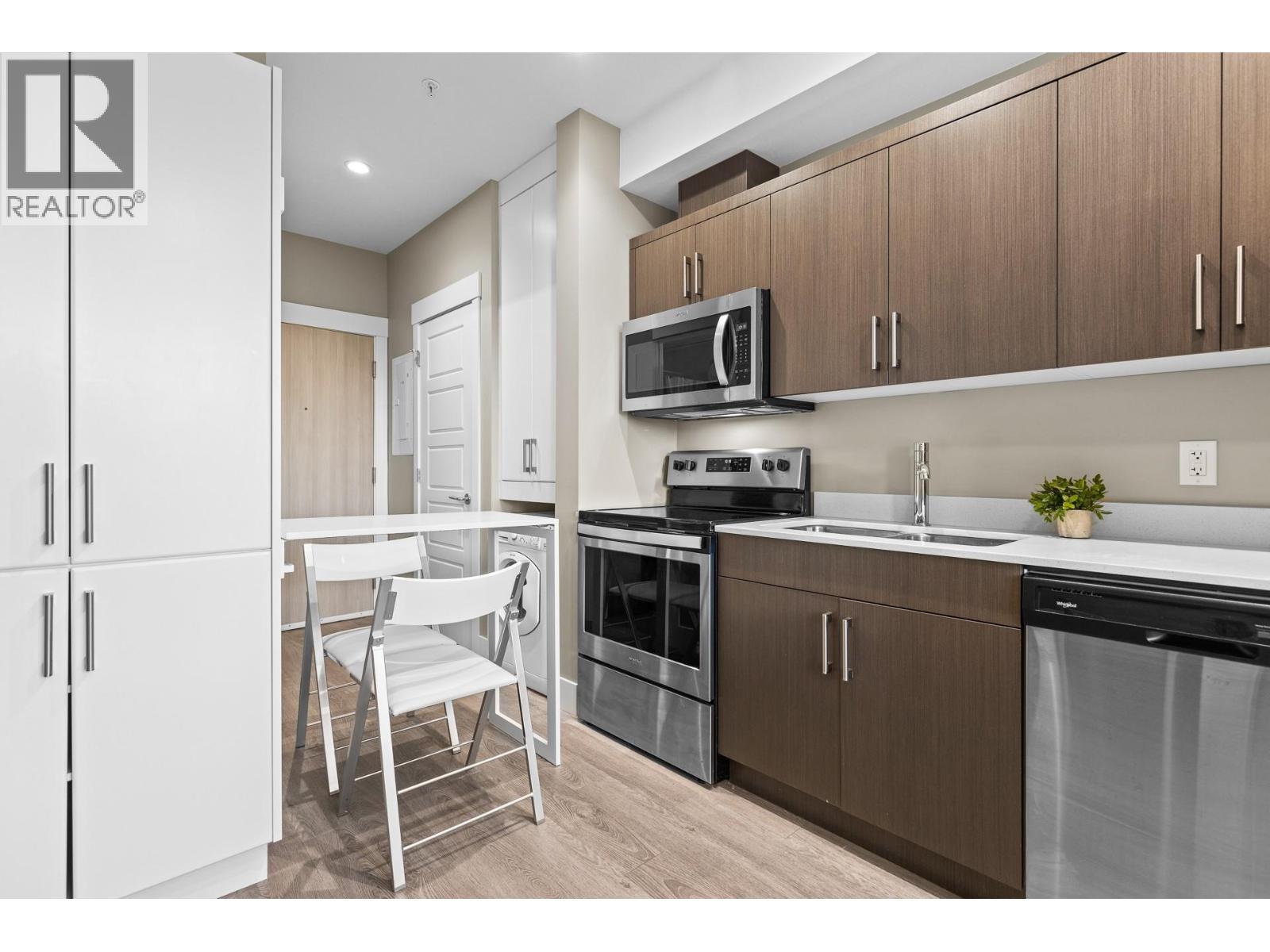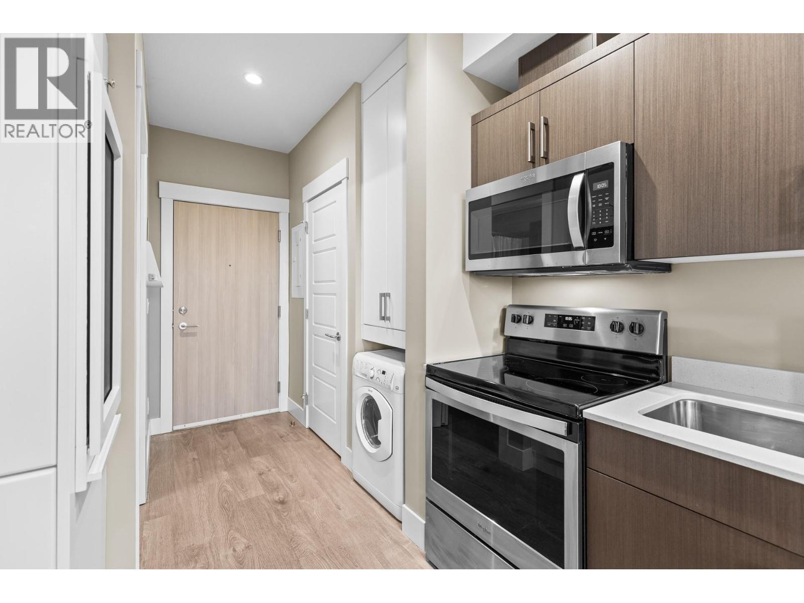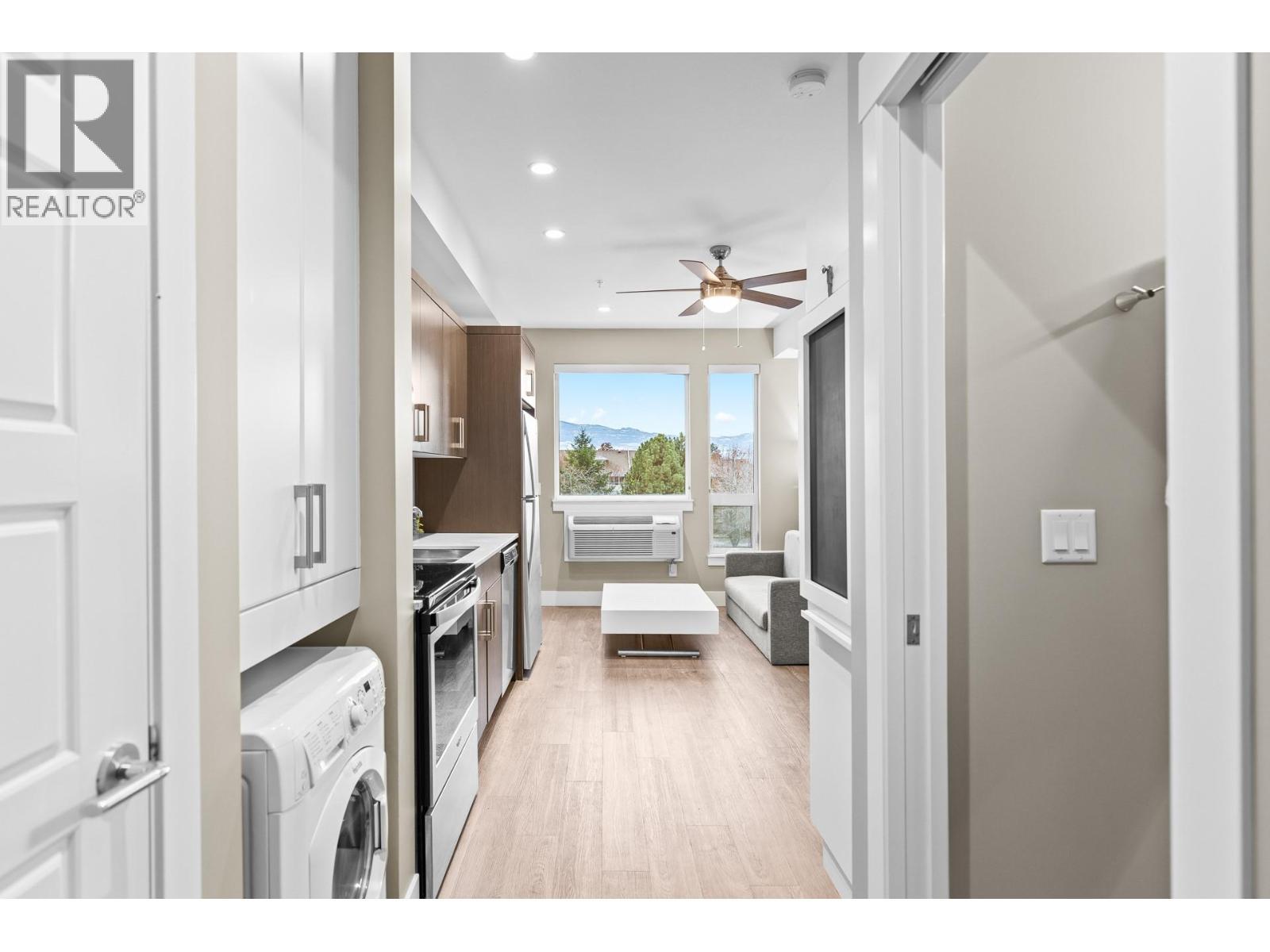 Welcome to Cambridge House - offering exceptional urban convenience in the heart of Kelowna. This 319 sq ft south-facing micro suite has been thoughtfully upgraded to maximize function and comfort featuring a custom Murphy Bed and built-in storage. The home is freshly painted and offered fully furnished, including sofa, TV, standing lamps, desk, chairs, and more, providing a turnkey living opportunity for owners or investors. The efficient layout includes stainless steel appliances, durable vinyl plank flooring, an in-suite washer/dryer, a 3-piece bathroom, and an in-wall heat pump/AC unit for year-round climate control. A covered parking stall and convenient same-floor 3' x 4' storage locker are included. Residents of Cambridge House enjoy an impressive selection of amenities, including a fully equipped fitness centre, residents’ lounge with games and seating areas and a landscaped garden terrace with BBQ area. The building is also pet-friendly (up to two pets, max 25 lbs each). Located steps from downtown, transit, and everyday amenities, this property appeals to first-time buyers, students, and investors seeking low-maintenance living in a central location. (id:6769)